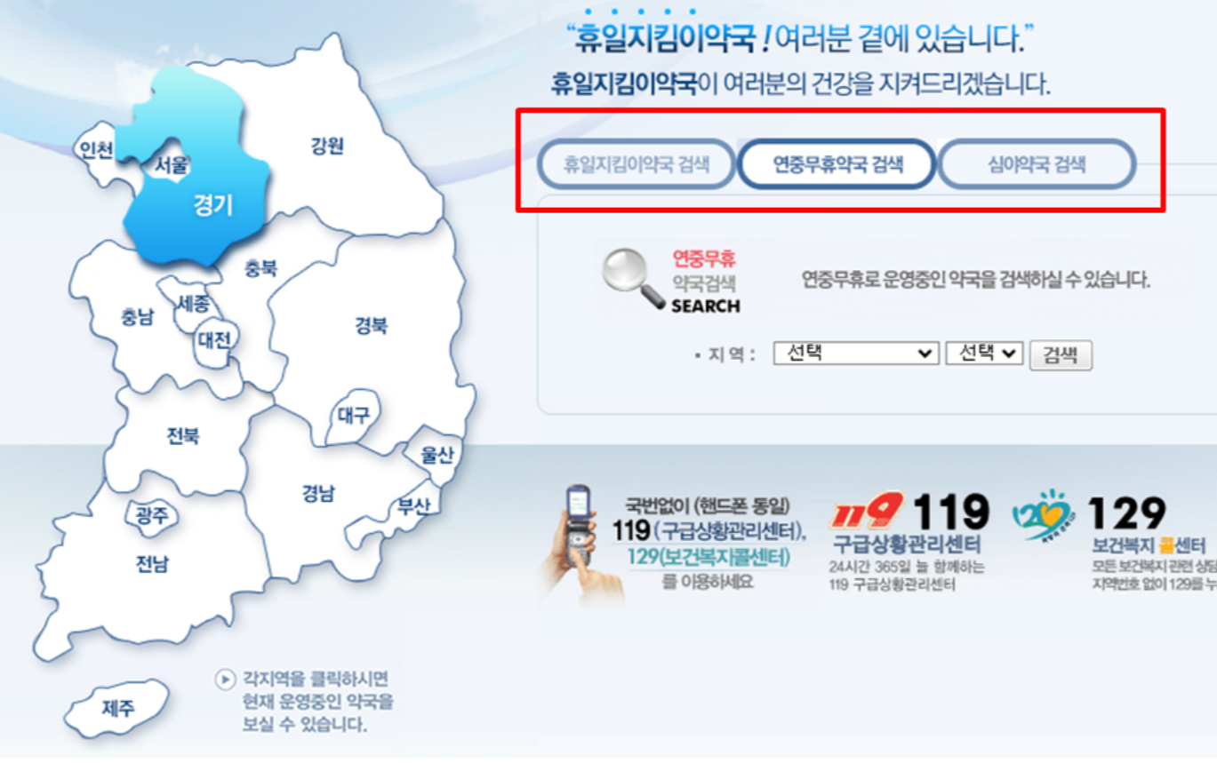 위의 홈페이지에서 휴일지킴이 약국, 연중무휴약국 또는 심야약국을 검색할 수 있습니다.